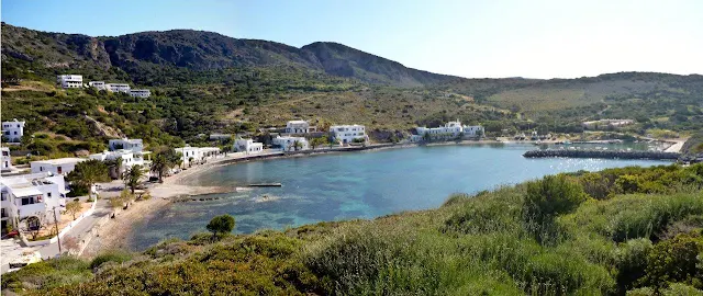 Dalla chiesetta sul promontorio tra le due baiette uno sguardo verso il castello e la bella spiaggia di Kapsali (adesso, dalla web cam!). Ovunque affittano camere anche sul mare ...